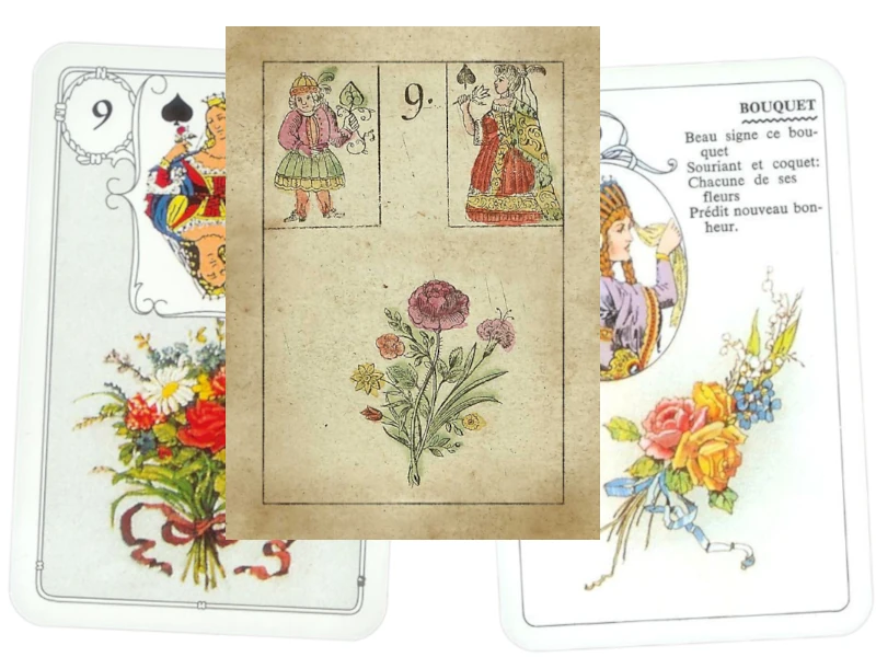 Par exemple, dans le Petit Lenormand classique, dans les versions traditionnelles, le Bouquet est souvent représenté par un arrangement floral généreux. Les illustrations varient selon les jeux : certaines cartes montrent un bouquet richement coloré, mêlant roses, coquelicots et marguerites, tandis que d'autres, plus anciennes, adoptent un style plus sobre ou stylisé, comme ces versions où le Bouquet est entouré de personnages ou de motifs rappelant les cartes à jouer traditionnelles. Chaque détail, des pétales aux rubans, semble conter une histoire de joie, de célébration et de promesses à venir.